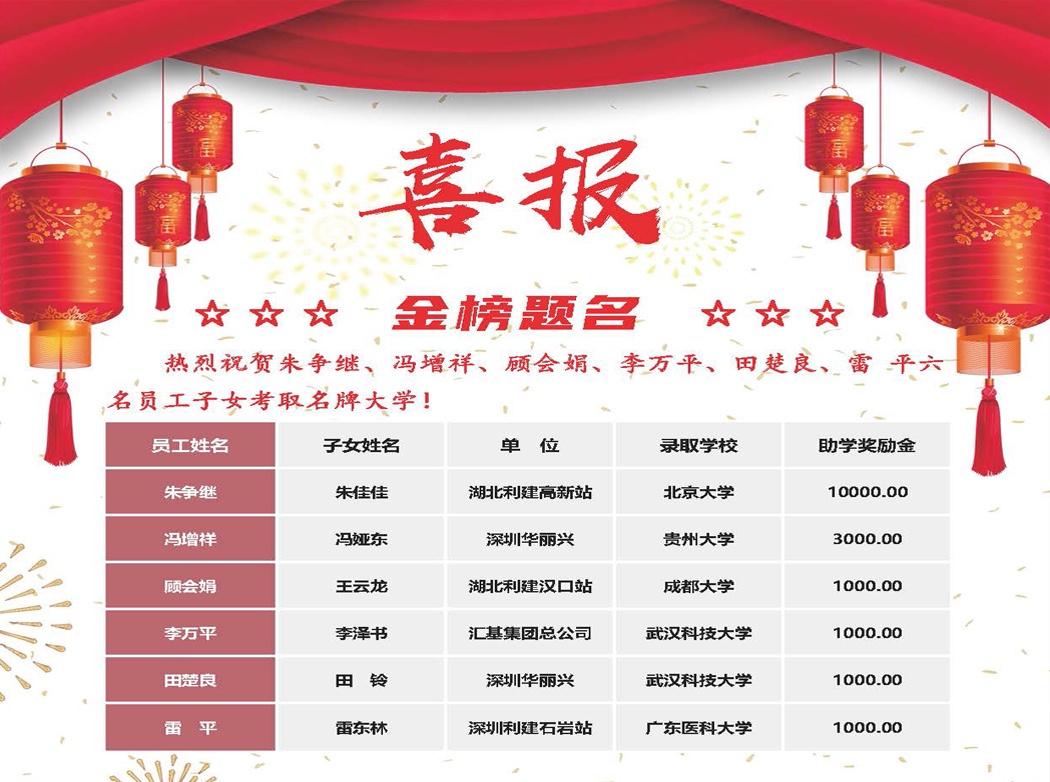 八月飞歌,金榜报喜。汇基集团员工子弟今年再创佳绩,共有6人考上全国重点大学,尤其是集团湖北高新分公司物流部员工朱争继子女,以688分的优异成绩被北京大学录取,获得集团助学基金奖励一万元!是集团的骄傲和广大汇基子弟学习的榜样。